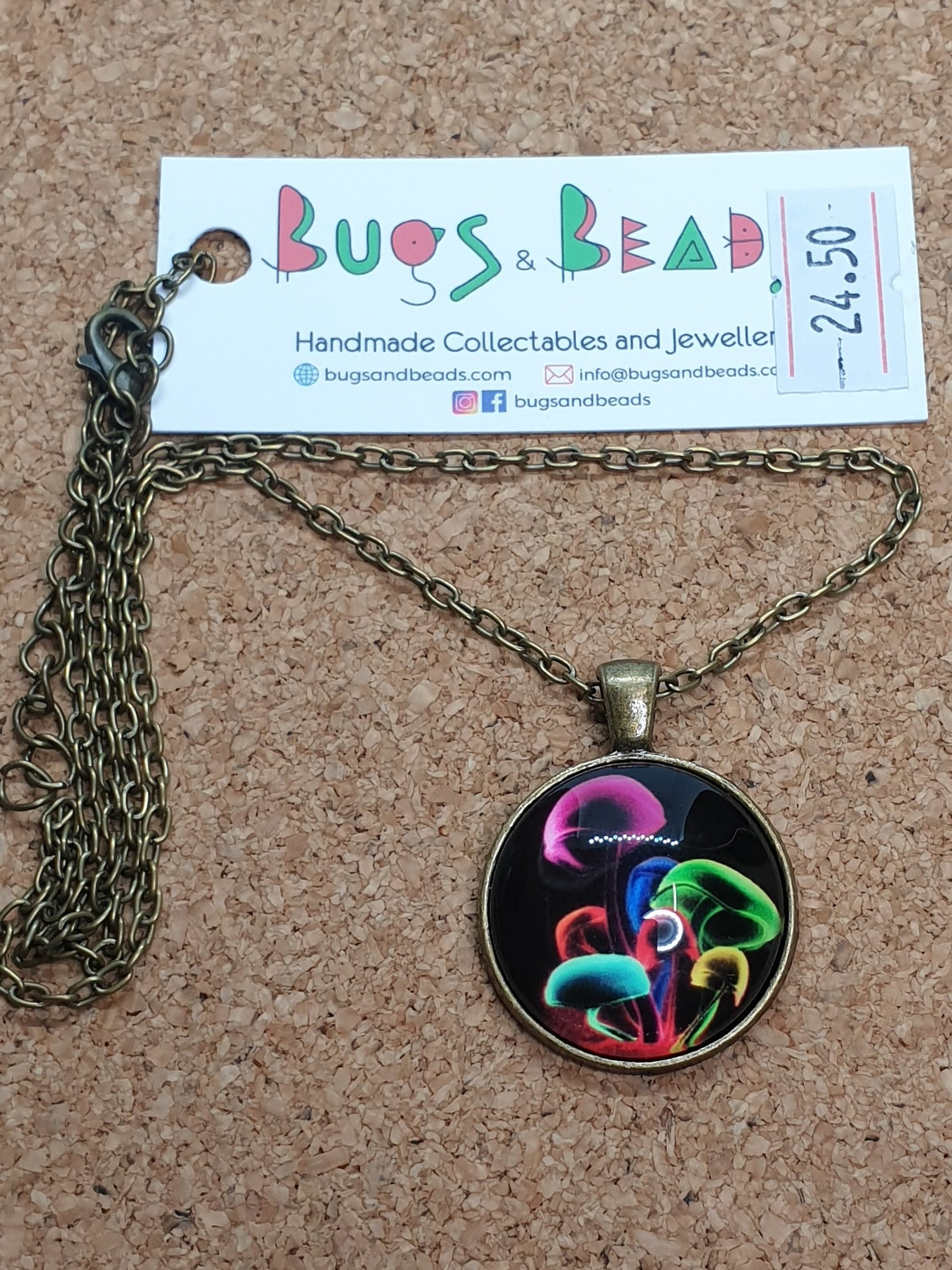 This glowing mushrooms necklace has been made with a bronze tone alloy bezel and chain and a glass cabochoon.