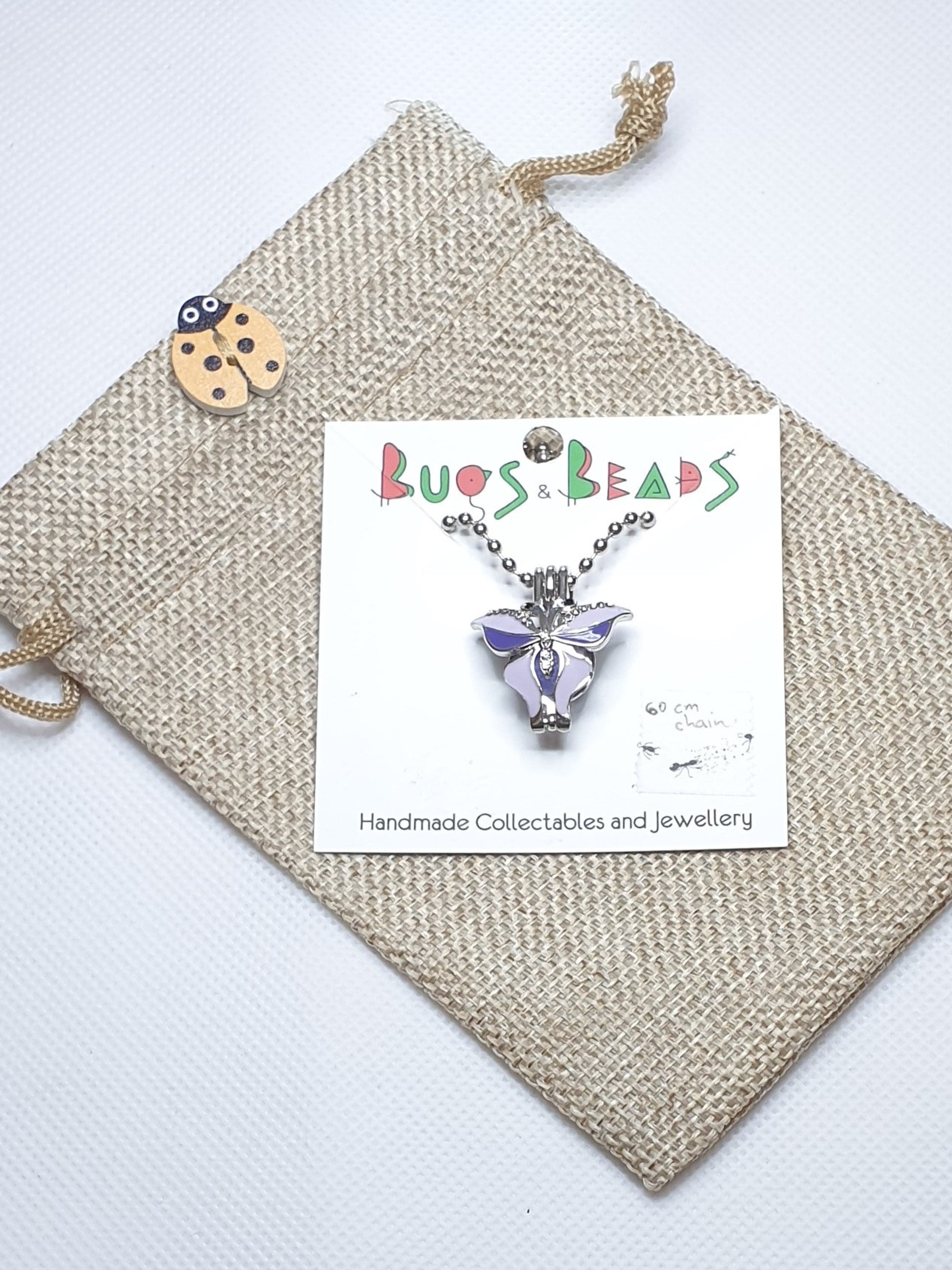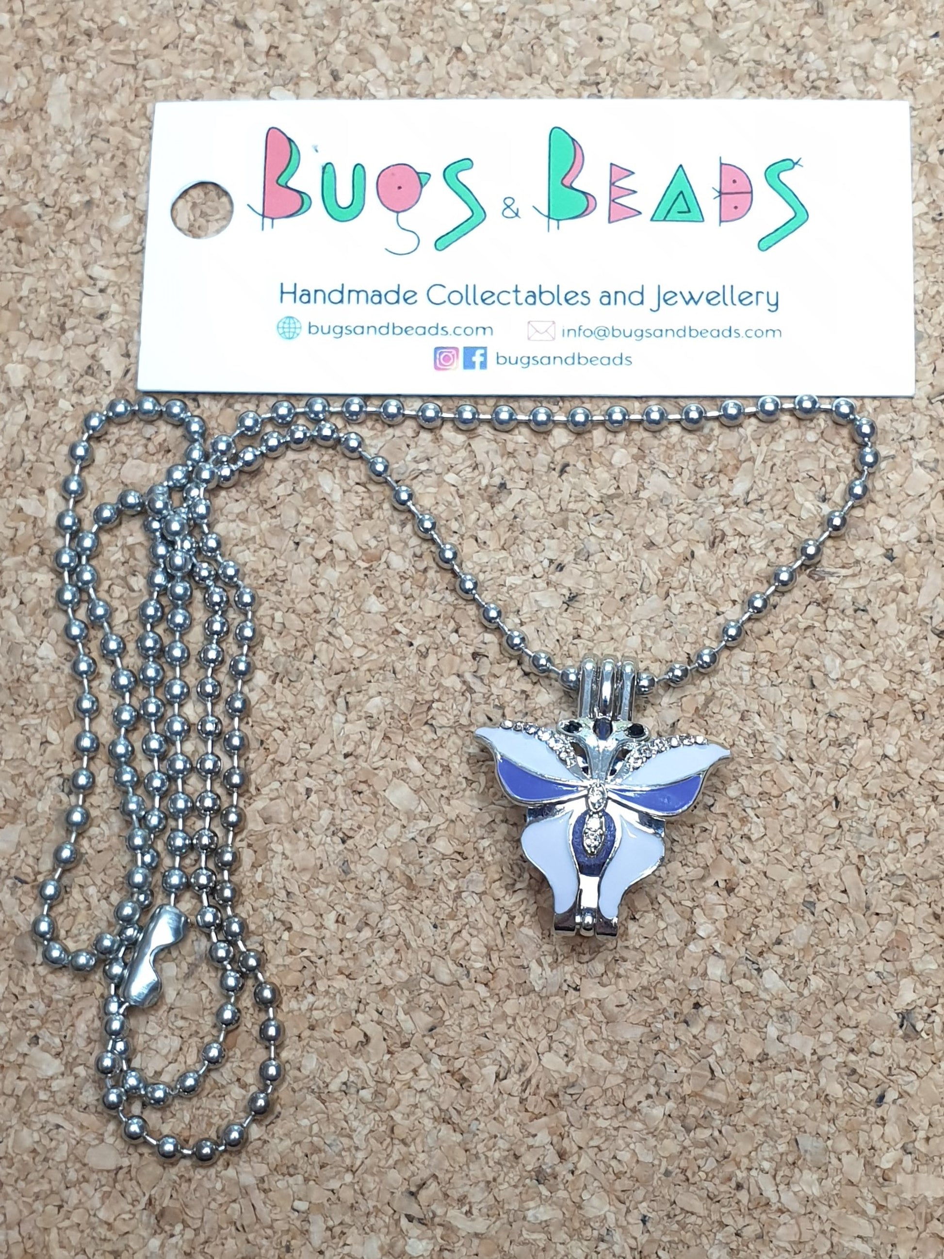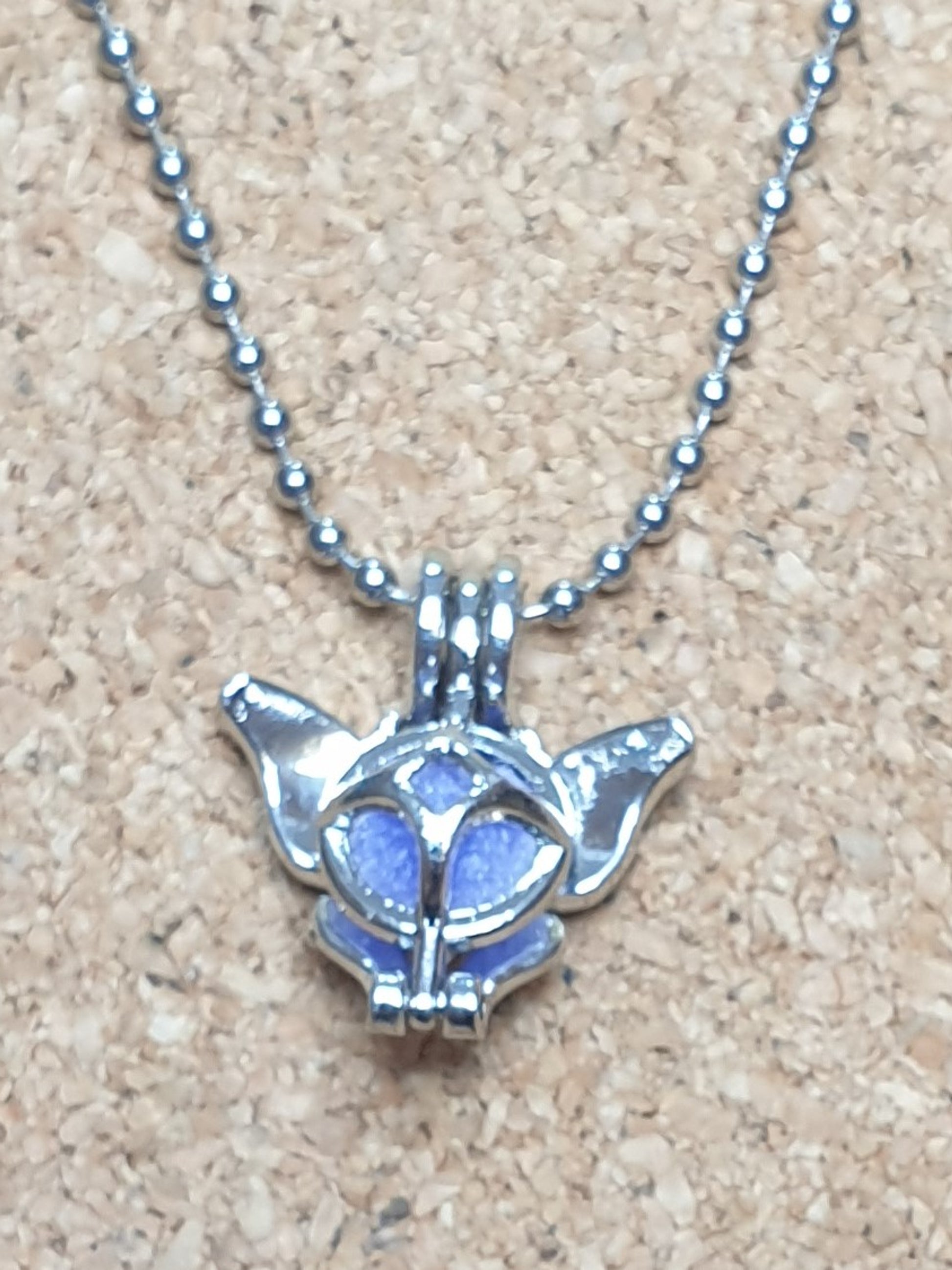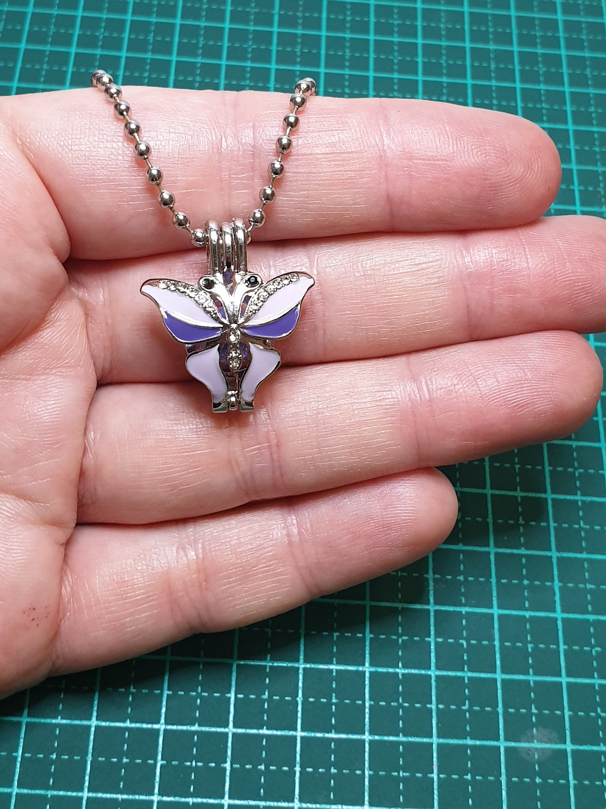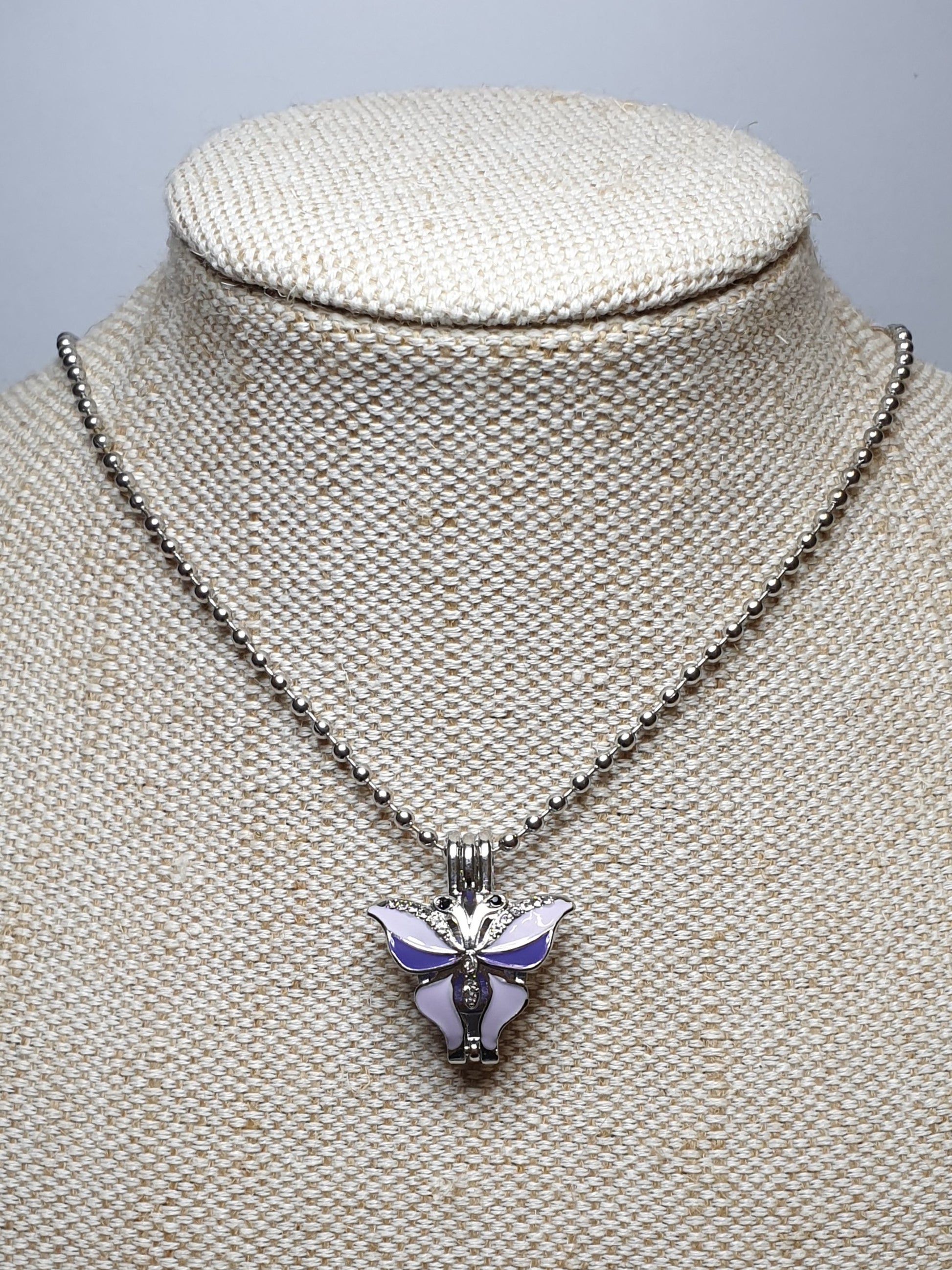 This is a very cute necklace with a silver tone butterfly keepsafe charm that can hold a small pompon for essential oils. The chain is stainless steel, so it is great for people with nickel or other base metal allergies/sensitivities. It comes with a pompom inside to put essential oils or your favorite perfume and three refils. Great for children and kids.
