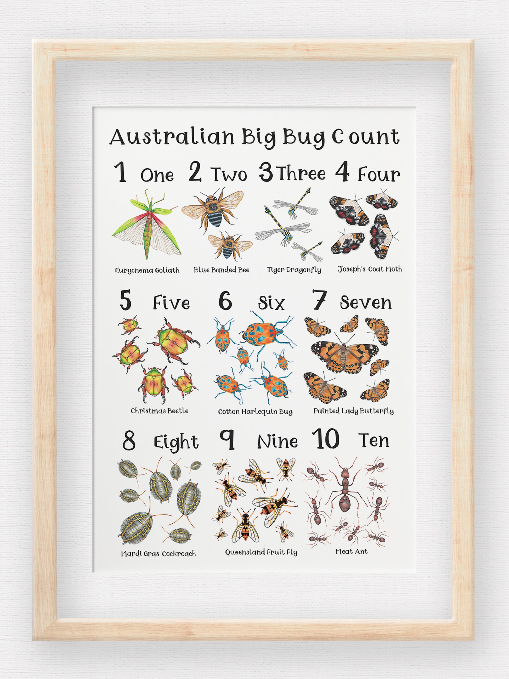 The BIG Bug Count! Get your kids learning their numbers and Native Australian Bugs and Insects! A bold and colourful hand-drawn print for your kids bedroom or play room. This is an art print featuring a collection of native Australian insects. The original artwork was painted with colouring pencils by the Australian Artist Abbi McClure.